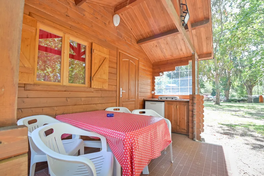 Chalet en bois de 19m² (sans eau ni installations sanitaires à l’intérieur) : un chalet confortable avec terrasse couverte, avec plaque de cuisson, frigo, table et chaises pour la restauration en plein air.